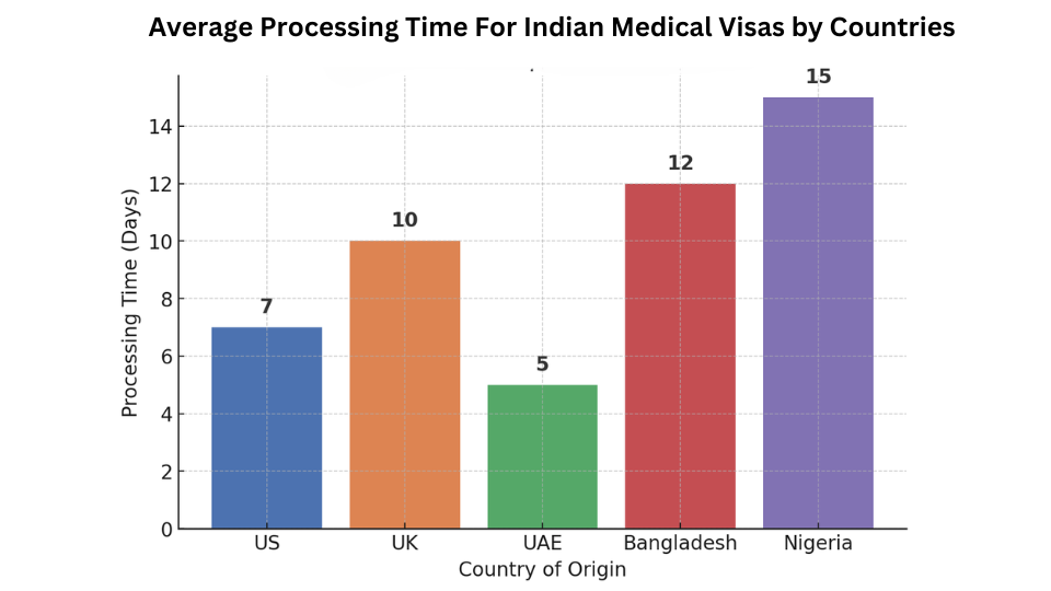 This bar chart shows the average processing time for an Indian medical visa based on the applicant's country of origin.